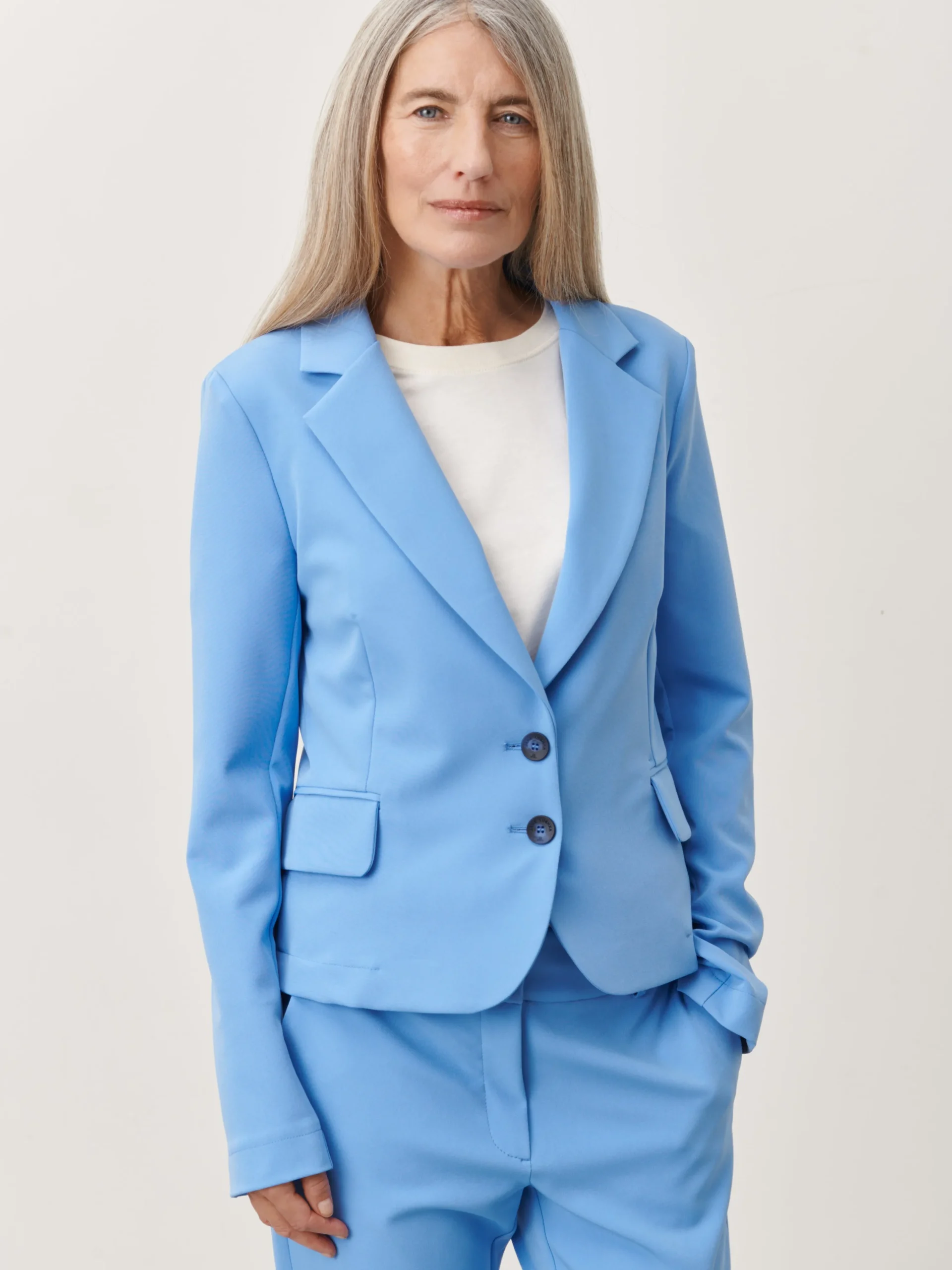 Blazer Atina: Redefine elegance with the Blazer Atina, crafted from recycled poly and elastane. Featuring a short and tailored fit, this blazer offers a modern and chic aesthetic. Elevate your sustainable fashion game effortlessly with Blazer Atina, a versatile and stylish choice for a refined look.The model is 1,79 cm tall and wearing size S.