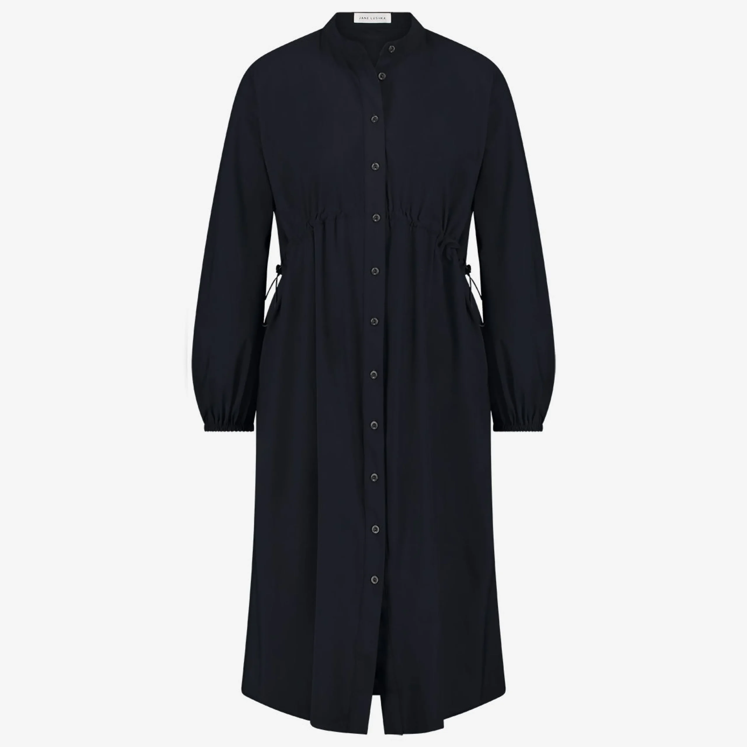 Elevate your wardrobe with the Dennis dress, a chic shirt dress crafted from light stretch technical jersey. The fitting detail adds a modern touch, creating a flattering silhouette. Long sleeves provide both style and comfort, while side pockets add a practical and casual element. Effortlessly blend sophistication with practicality in the Dennis Dress, perfect for a polished yet comfortable look.The model is 1,79 cm tall and wearing size S.