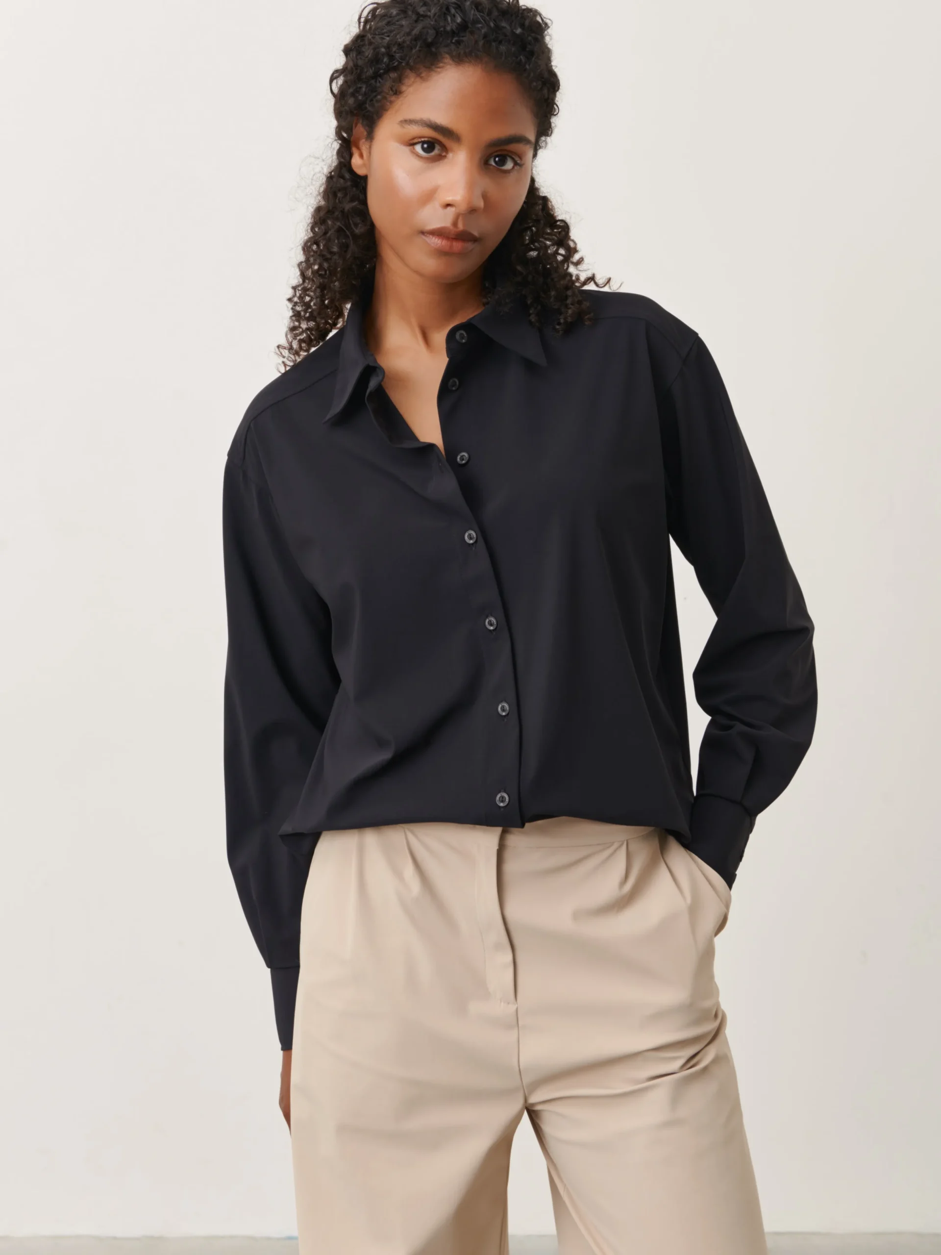 Ivona Blouse: Elevate your wardrobe with the Ivona Blouse, crafted from high tech italian jerasay.The loose fit ensures comfort while exuding contemporary style. Make a statement effortlessly with the Ivona Blouse, designed for those who appreciate a perfect fusion of comfort and chic aesthetics.The model is 1,79 cm tall and wearing size S.