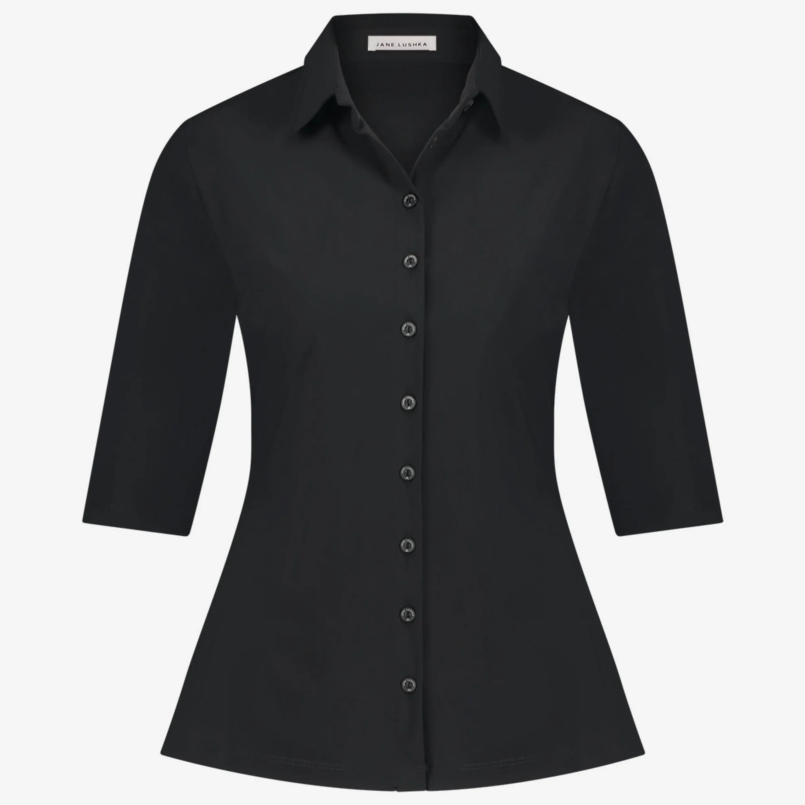 The Kikkie blouse is a versatile and stylish piece made from stretch technical Jersey material. This basic blouse features 7/8 sleeves, making it perfect for transitioning between seasons. The minimalist design ensures it can be paired with a variety of different outfits, making it a great addition to any wardrobe. The high-quality fabric and construction ensure that this blouse is comfortable and durable, making it a smart investment for any fashion-savvy individual. The model is 1,79 cm tall and wearig size S.