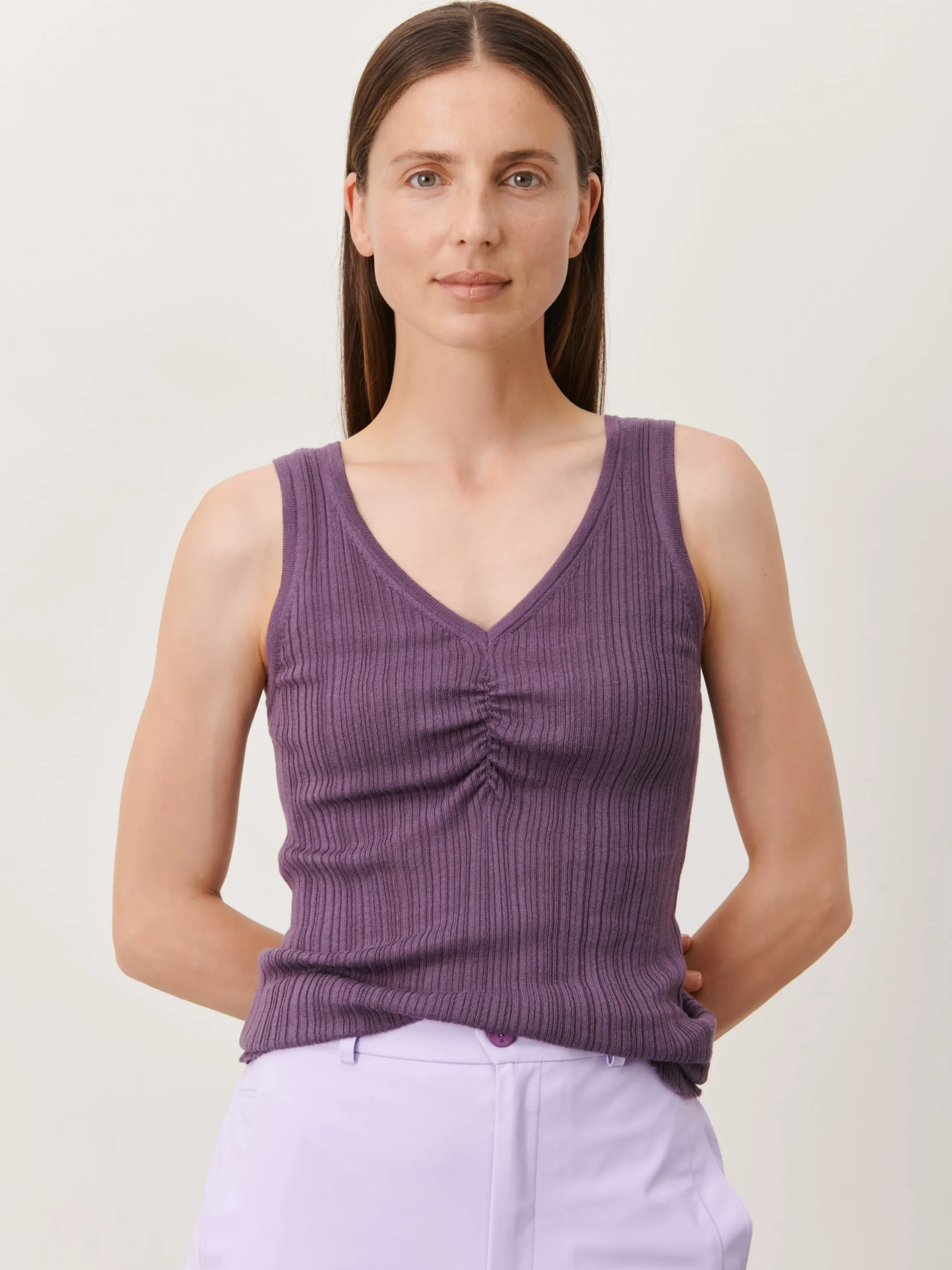 Narnali Vest: Embrace a blend of comfort and style with the Narnali Shirt. Crafted from a mix of cotton and viscose, this top features a V neck, sleeveless, and a slim fit for a modern silhouette. Perfect for various occasions, the Narnali Top combines versatility with a touch of sophistication, making it an essential addition to your wardrobe. The model is 1,79 cm tall and wearing size S.