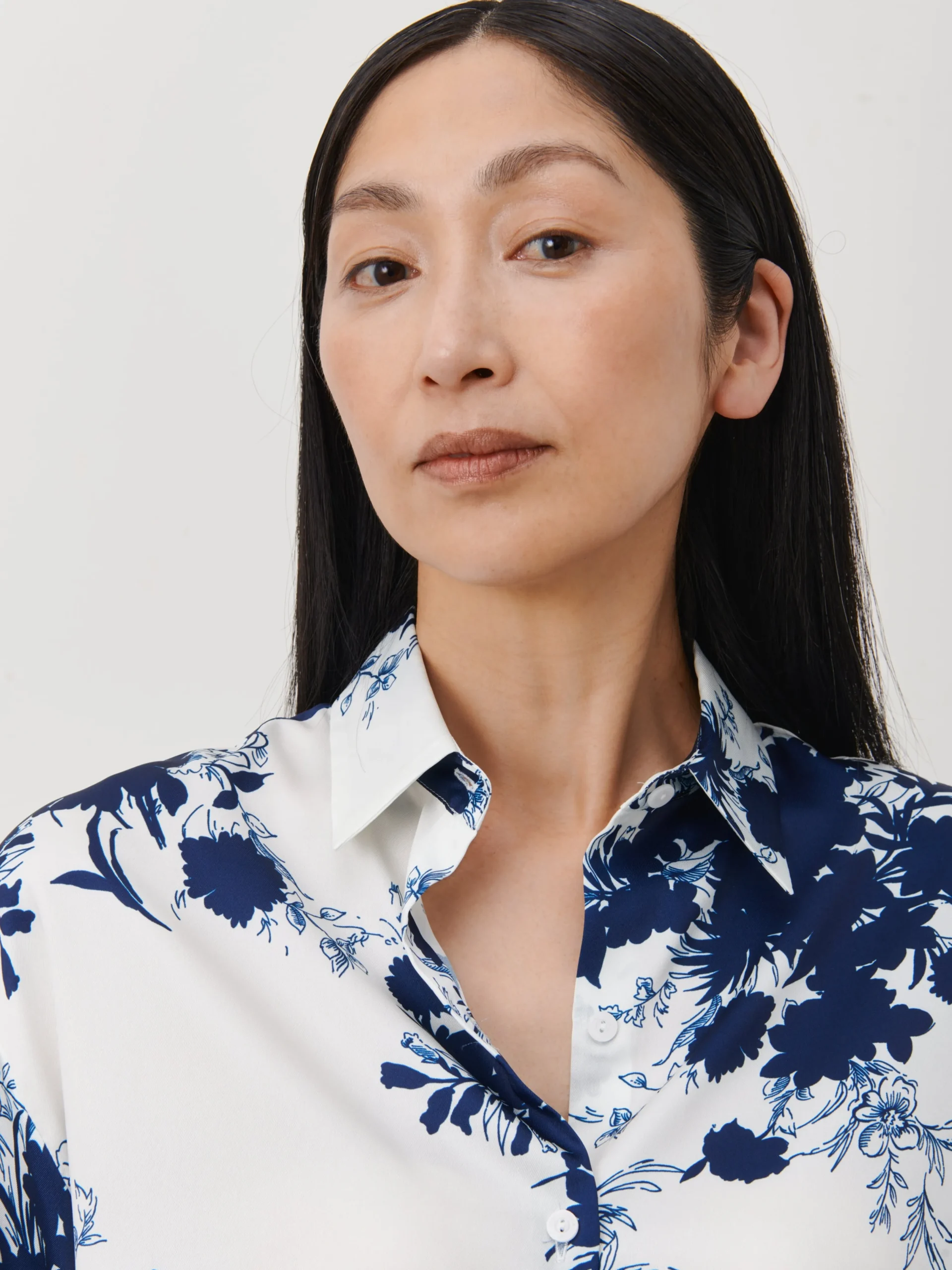 The Sally blouse is a sophisticated and effortlessly elegant garment made from high-quality 100% recycled polyester. It features a feminine silhouette and a buttoned shirt design, adding a touch of classic style. With its sophisticated chic aesthetic and playful print, the Sally blouse is versatile for various occasions. Whether paired with tailored pants or a skirt, it adds a refined and polished touch to any outfit. The model is 1,79 cm tall and is wearing size S.