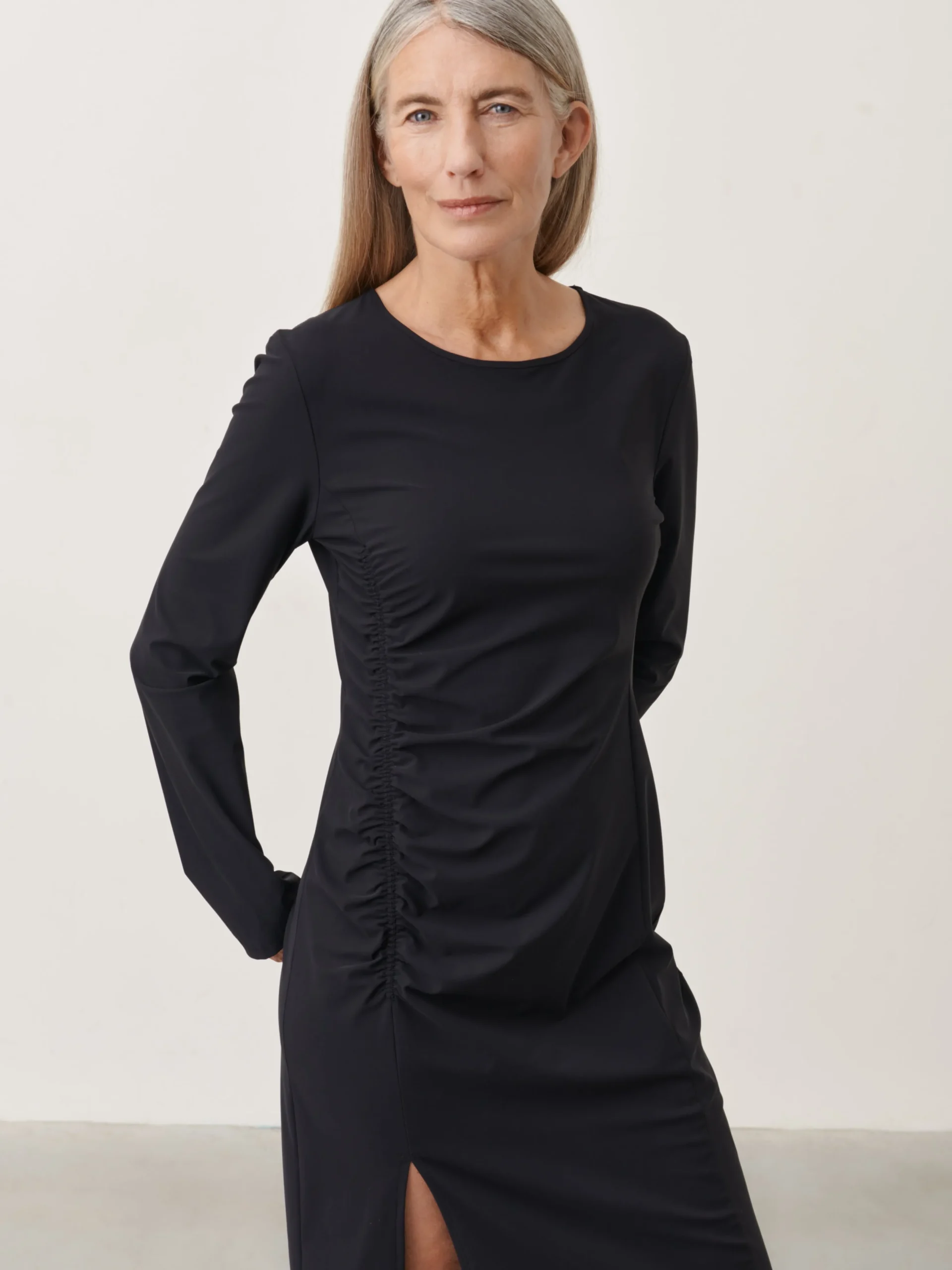 Embrace elegance and comfort with the Scarlet dress, a refined piece crafted from light stretch technical jersey. The long sleeves offer a sophisticated touch, while the front split adds a hint of allure. Set in the front, this dress strikes the perfect balance between chic and practical. The model is 1,79 cm tall and wearing size S.