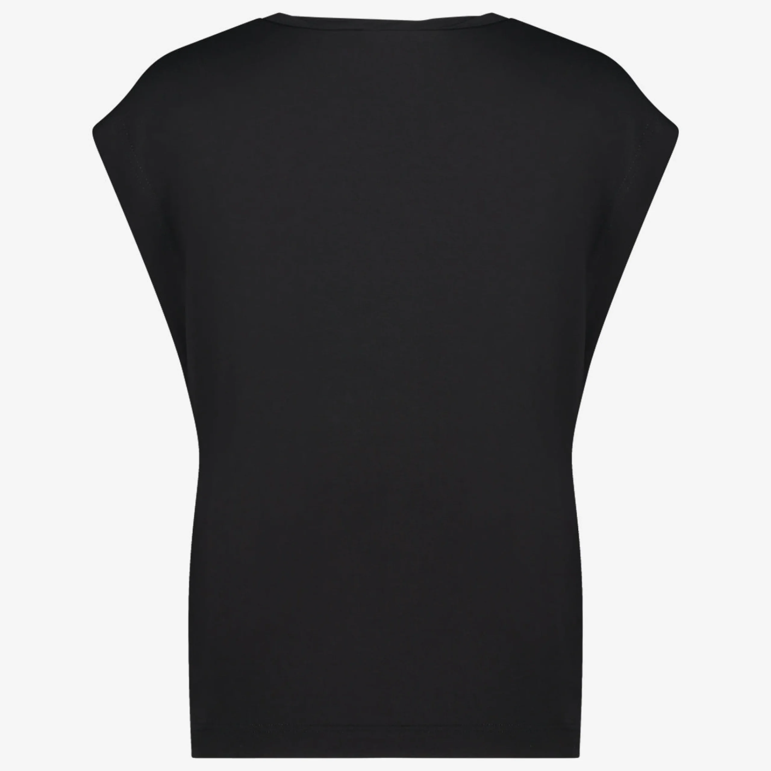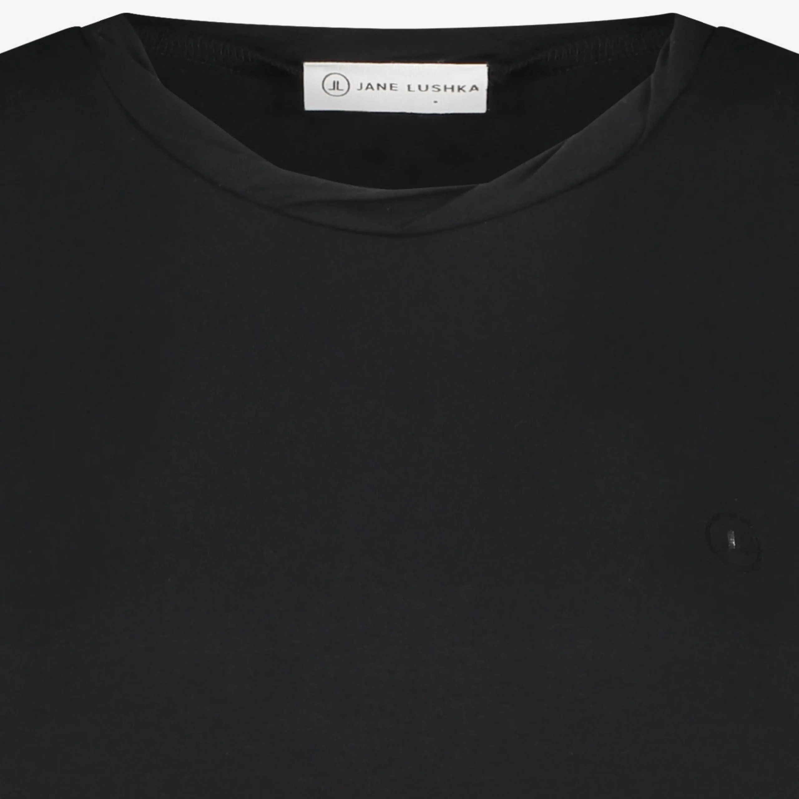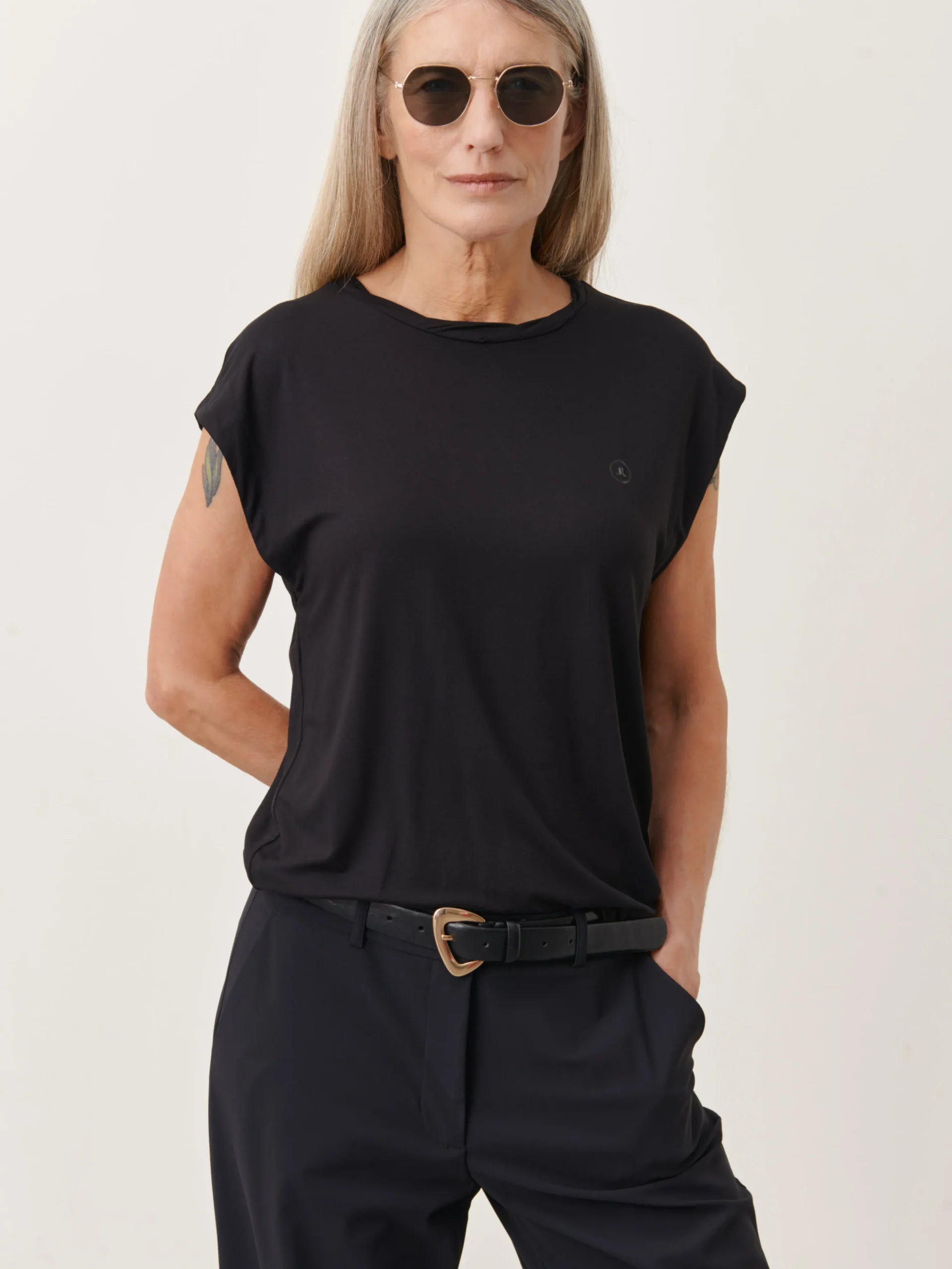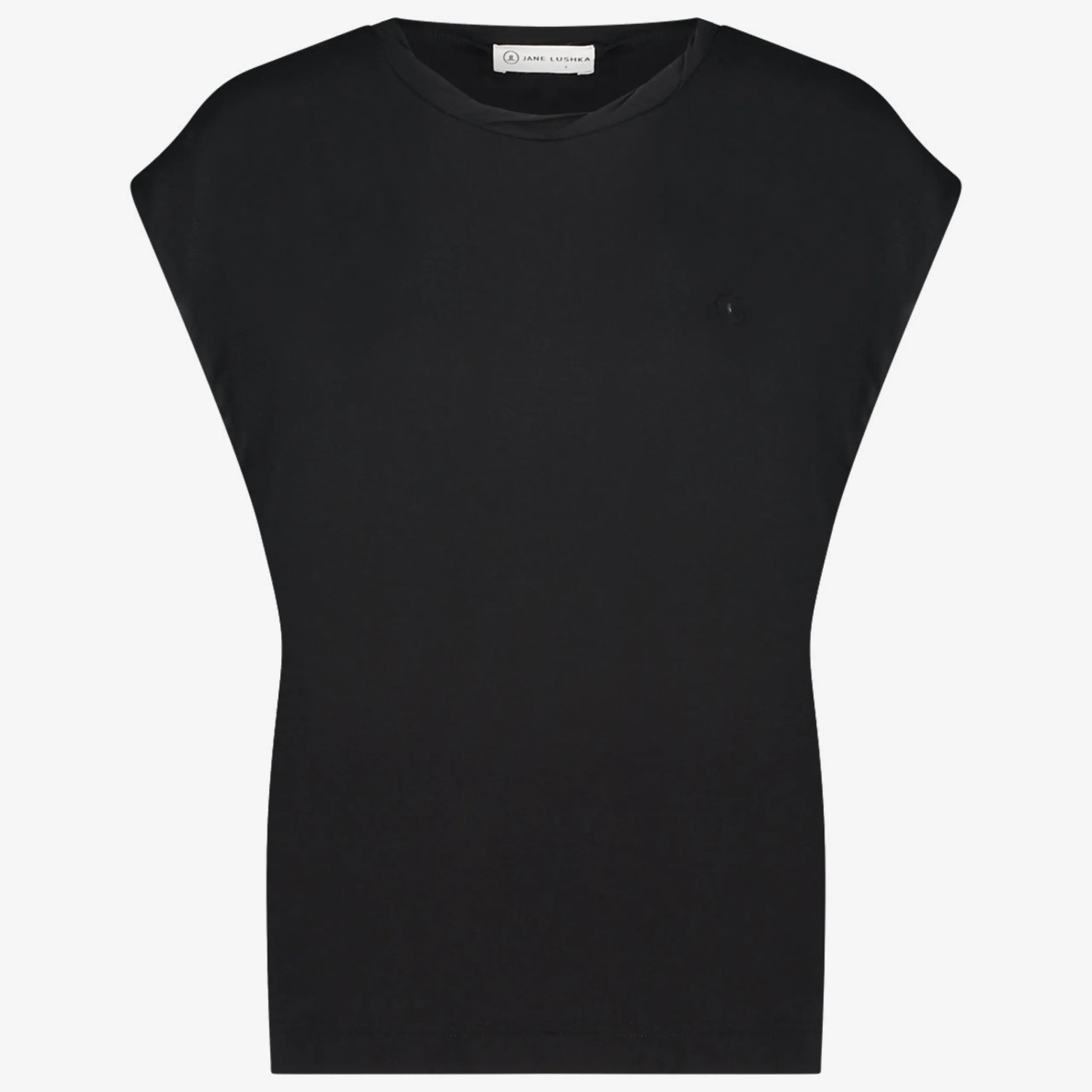 Maria T-Shirt: Experience comfort and style with the Maria T-Shirt. Crafted from viscose, this sleeveless tee features a curved neckline for a modern and flattering look. The subtle JL logo adds a touch of sophistication, making the Maria T-Shirt a versatile choice for casual outings or layering under your favorite pieces.The model is 1,79 cm tall and wearing size S.