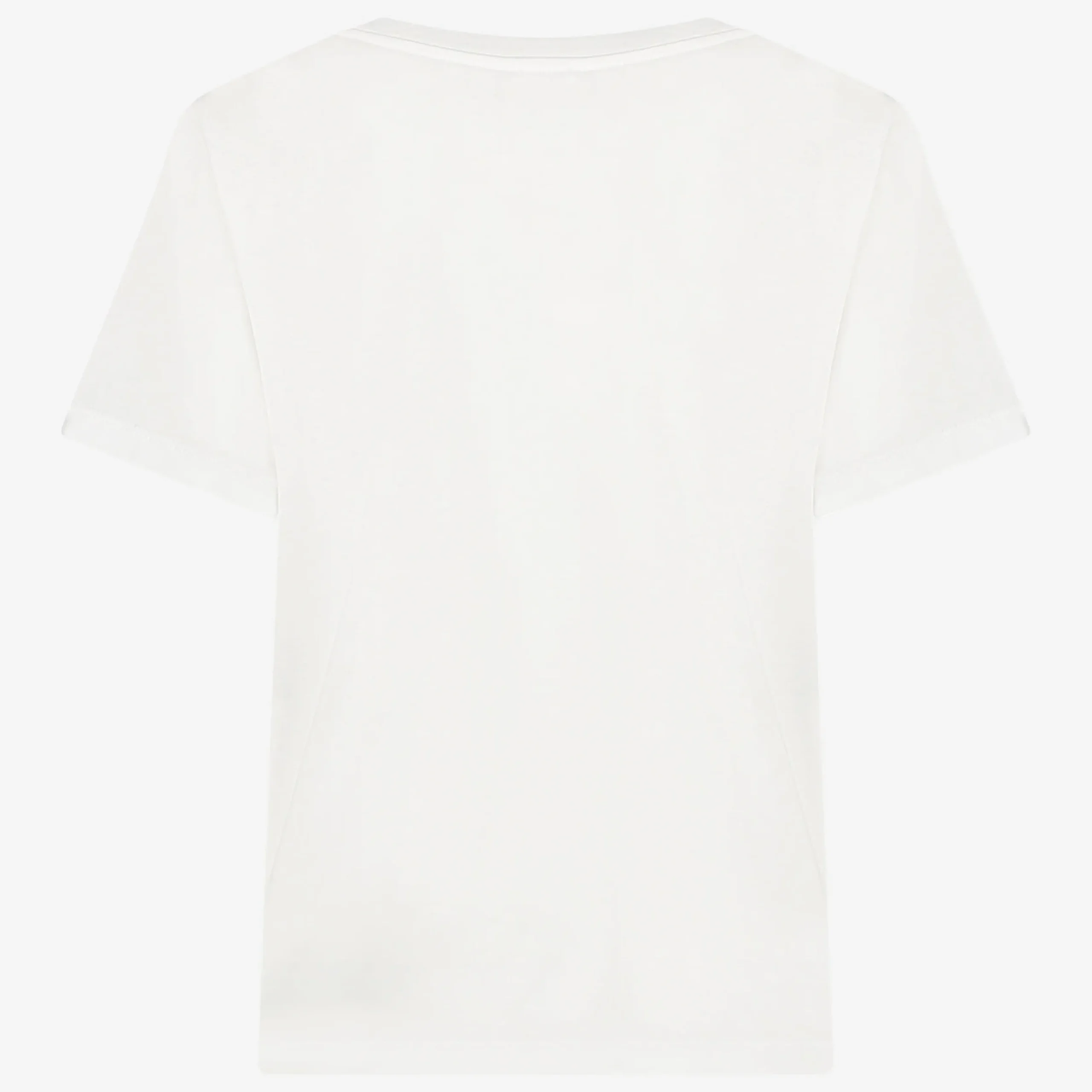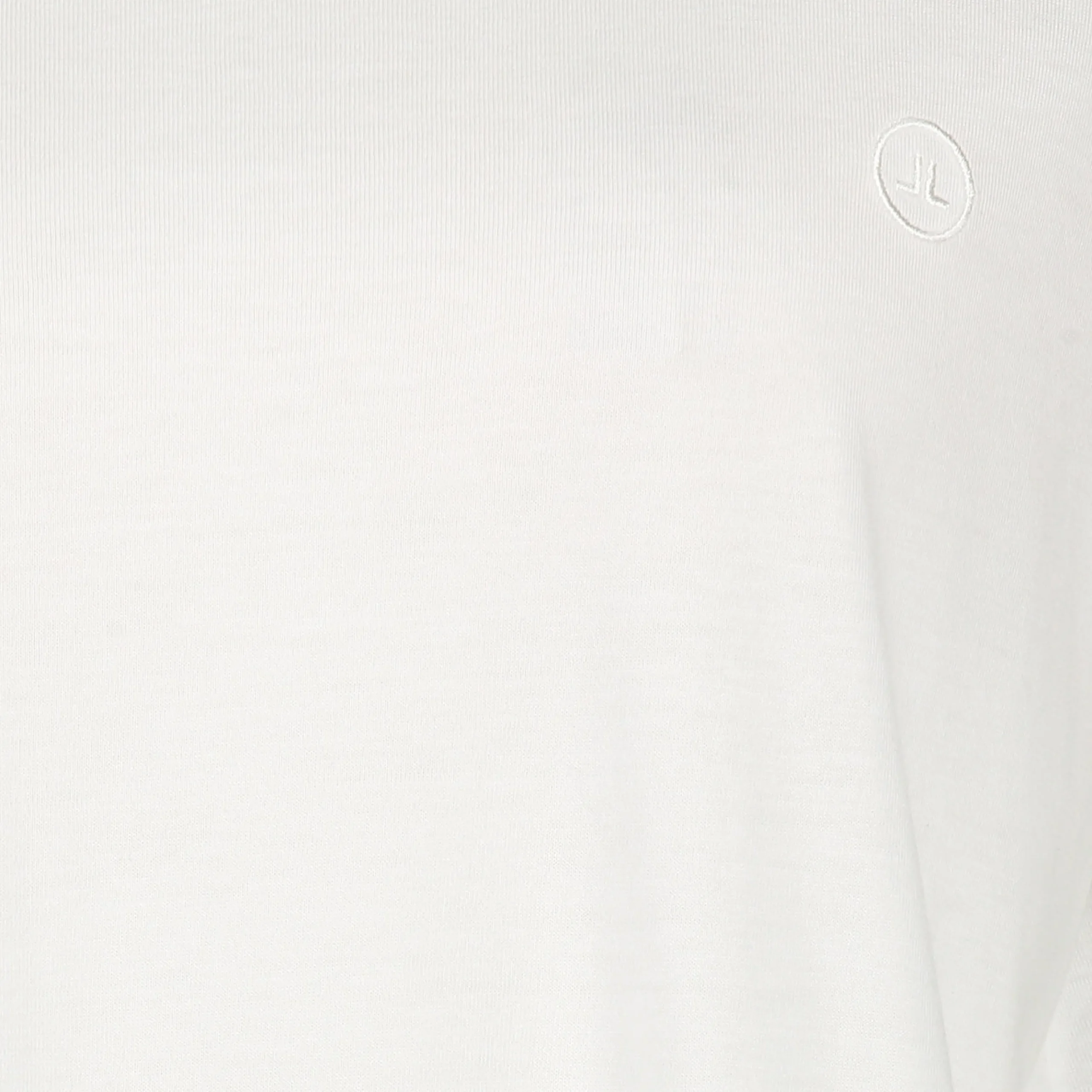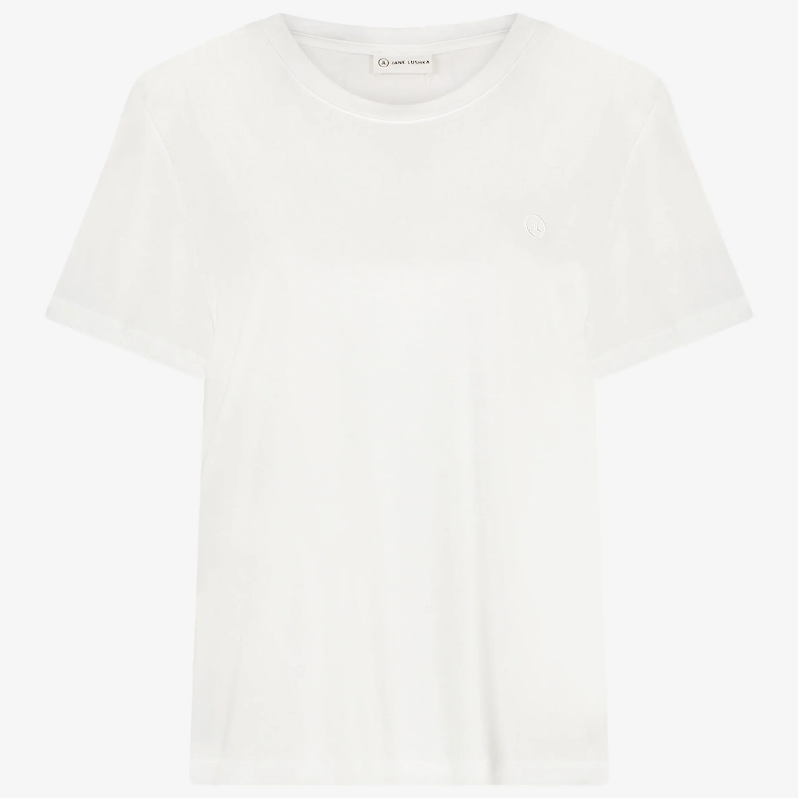 Nancy T-Shirt: Elevate your casual wardrobe with the Nancy T-Shirt. Made from organic cotton, this basic tee features a clean and simple design with a small JL logo, adding a subtle touch of style. The short sleeves provide a classic look, making the Nancy T-Shirt a versatile and comfortable choice for everyday wear. The model is 1,79 cm tall and wearing size S.